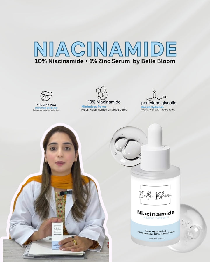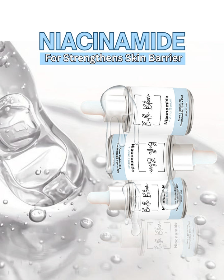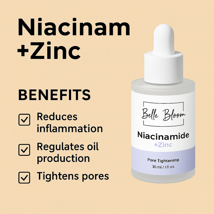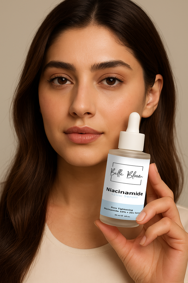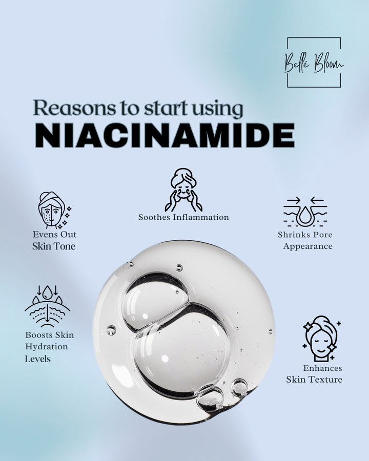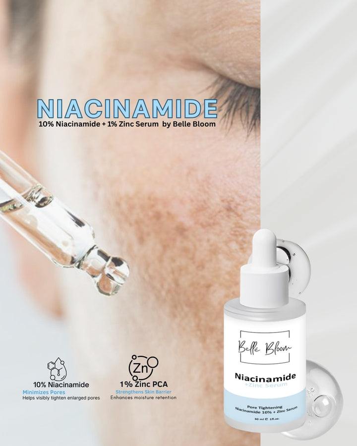 - Apply 4-5 drops of Bellé Bloom Niacinamide + Zinc serum in the morning and evening over freshly cleansed face & neck.
